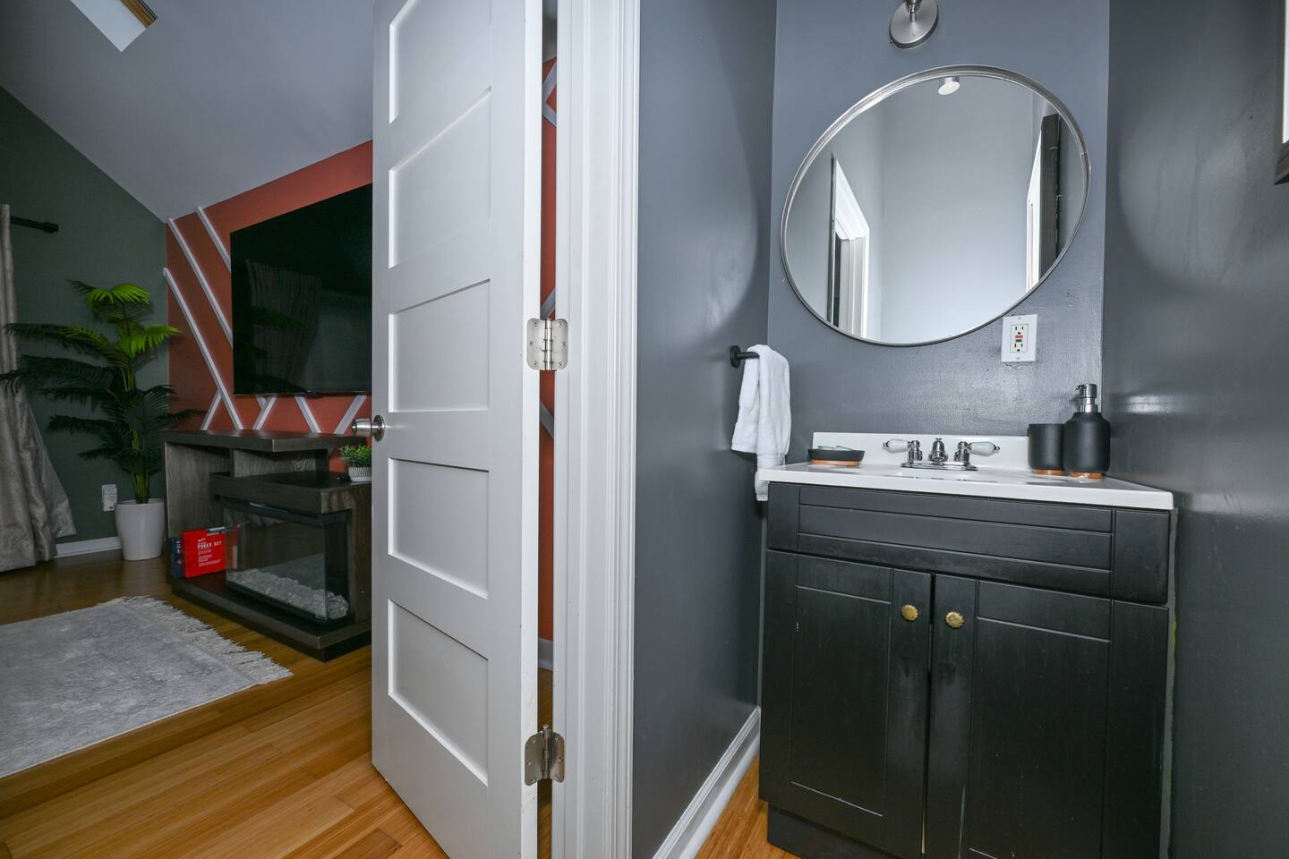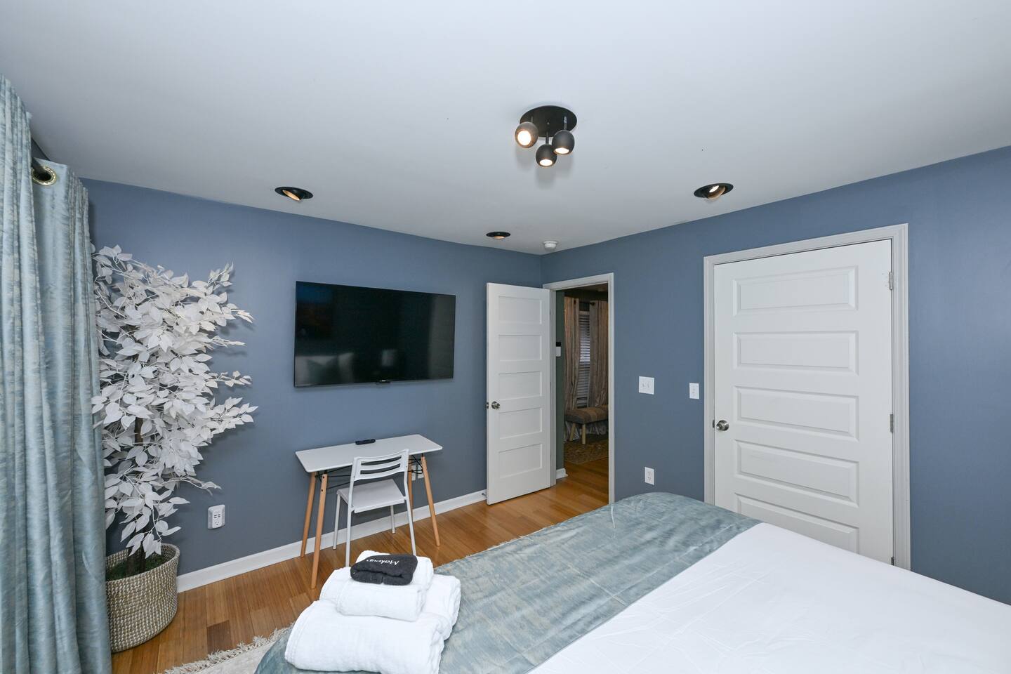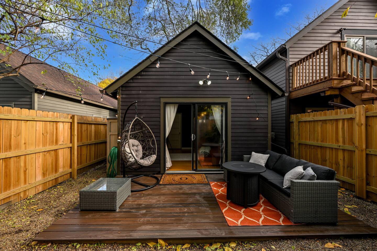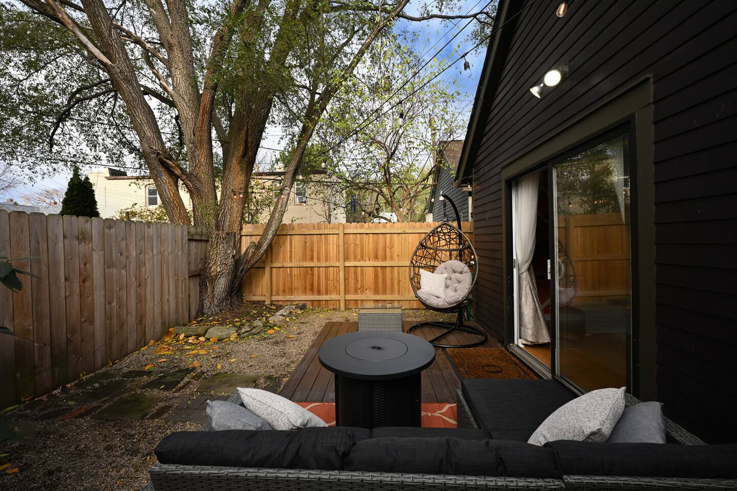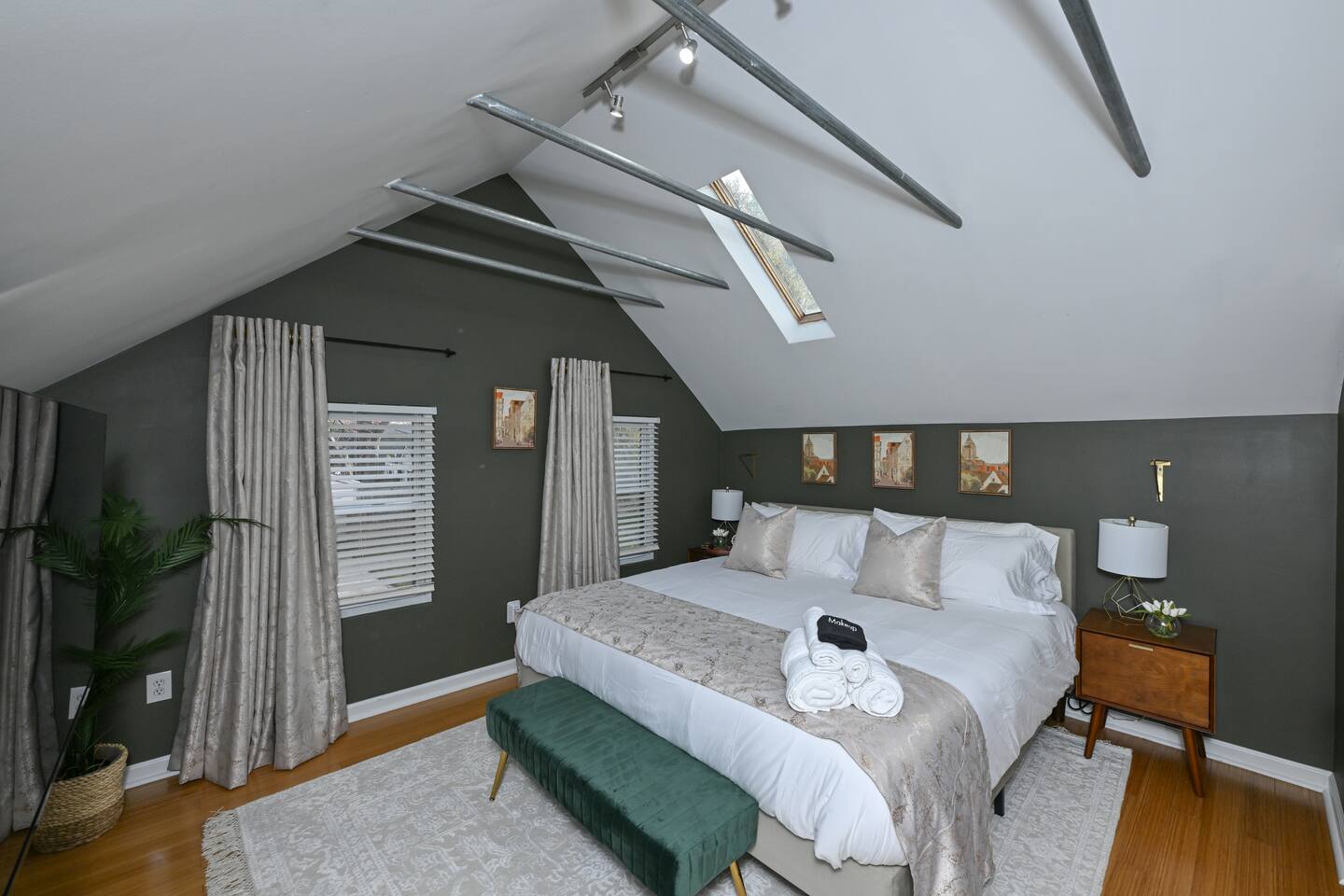 This beautiful 2 bed room 1.5 bath home is fully equipped with everything you’ll need for a most enjoyable stay. Cozy up downstairs on the large sofa with ample sitting, pillows and blankets. For those chilly, Cleveland nights, a beautiful multi color fireplace will be sure to give some additional warmth. Should you choose to cook, a fully stocked kitchen with everything you may need to prep that gourmet meal has been setup for your convenience. If cooking isn’t on the agenda, the table is set and there are lots of great dinning/ take out options near by. A half bathroom, good sized bedroom with a large, comfortable king sized bed and a work station complete the downstairs living area. A short walk up the stairs where a piece of the old blends with the new leads you to the Master area. A beautiful foyer leads to another large bedroom with a super comfortable king sized bed. Here you’ll find a full sized bathroom to finish up this space. Enjoy the sunrise through the windows and skylight but should you choose, each room has sun blocking drapes. Outdoors, you’ll find a beautiful and private sitting area. Lounge on the couch or just chill/read a book in the hanging egg chair. You’ve got choices. An outdoor charcoal grill has been provided as well. This neighborhood boasts great walking and biking scores. Parks, gyms and several local highlights/restaurants are all within walking distance to this gem. If a great stay in a great location is what you are in search of, your search is over! See amenities for detailed offerings.