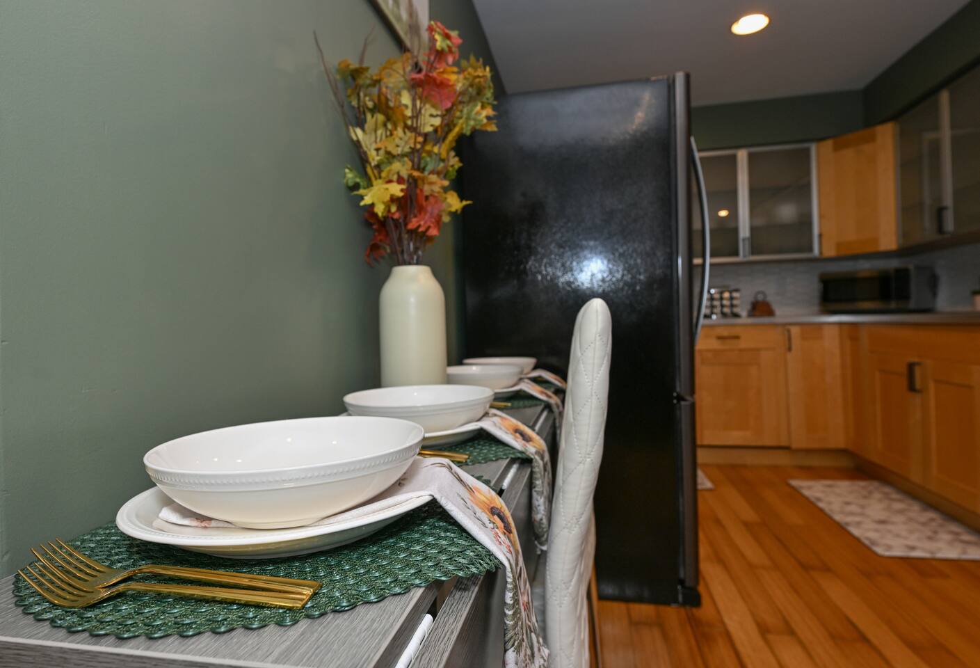 The controls for the electric fireplace are engraved on the front panel and are not easily visible. The dining table in the kitchen is expandable to sit four comfortably (additional chairs are in the laundry room) A wooden plank is placed beside the sliding glass door that leads to the patio. Please pull out prior to sliding door open. As regards pets - Only 1 pet is allowed - Only small to medium sized dogs are allowed - Dogs must be well trained and not bark excessively - Dogs must never be left alone and unattended in the home. A doorbell with camera is installed for your convenience and for monitoring the front door. Exterior camera is installed on the left side of the house that monitors entry and exit.